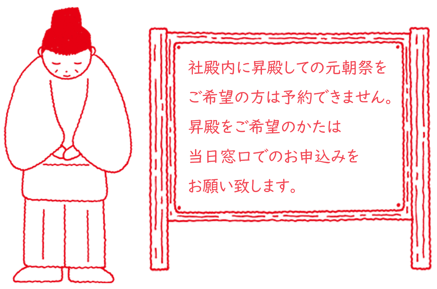 1月8日頃までは多数の方がご参拝され、境内が過密な状態になる恐れがあります。混雑や長時間の待ち時間、感染症への不安をお持ちの方の為に、個人・ご家族様を対象とした「参列なし祈願」のご予約を承ることに致しました。